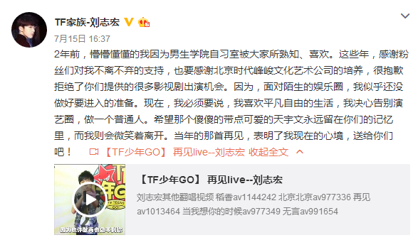 7月15日,曾经是TF家族一员的刘志宏在微博上突然发文宣布退出演艺圈,做一位普通人。同时,他也在微博上发布告别视频,为粉丝们最后献上了张震岳的歌曲《再见》,而他的师兄TFBOYS三位成员也送上了祝福对他表示支持。